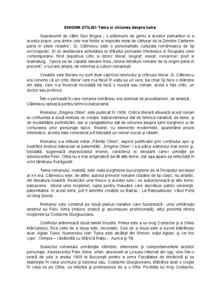 Enigma Otiliei Eseu Tema Si Viziunea Despre Lume