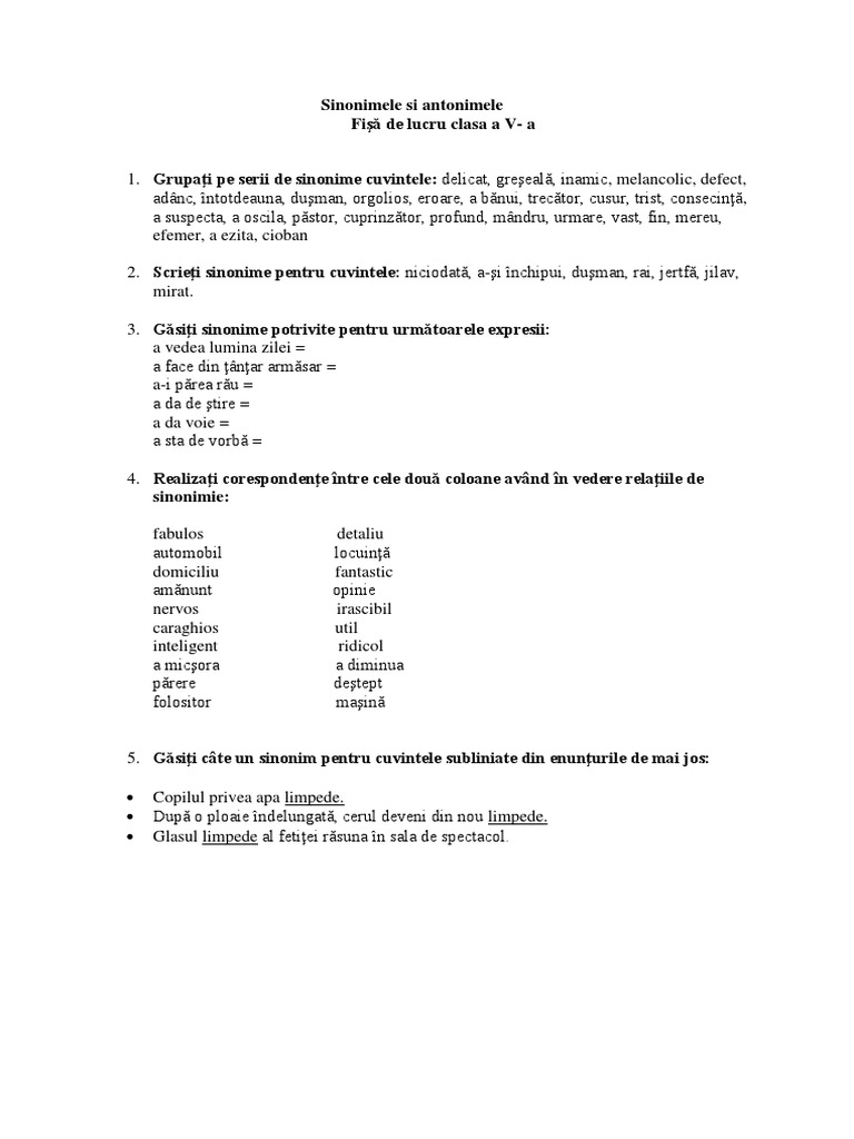 Sinonimele Si Antonimele Fisă De Lucru