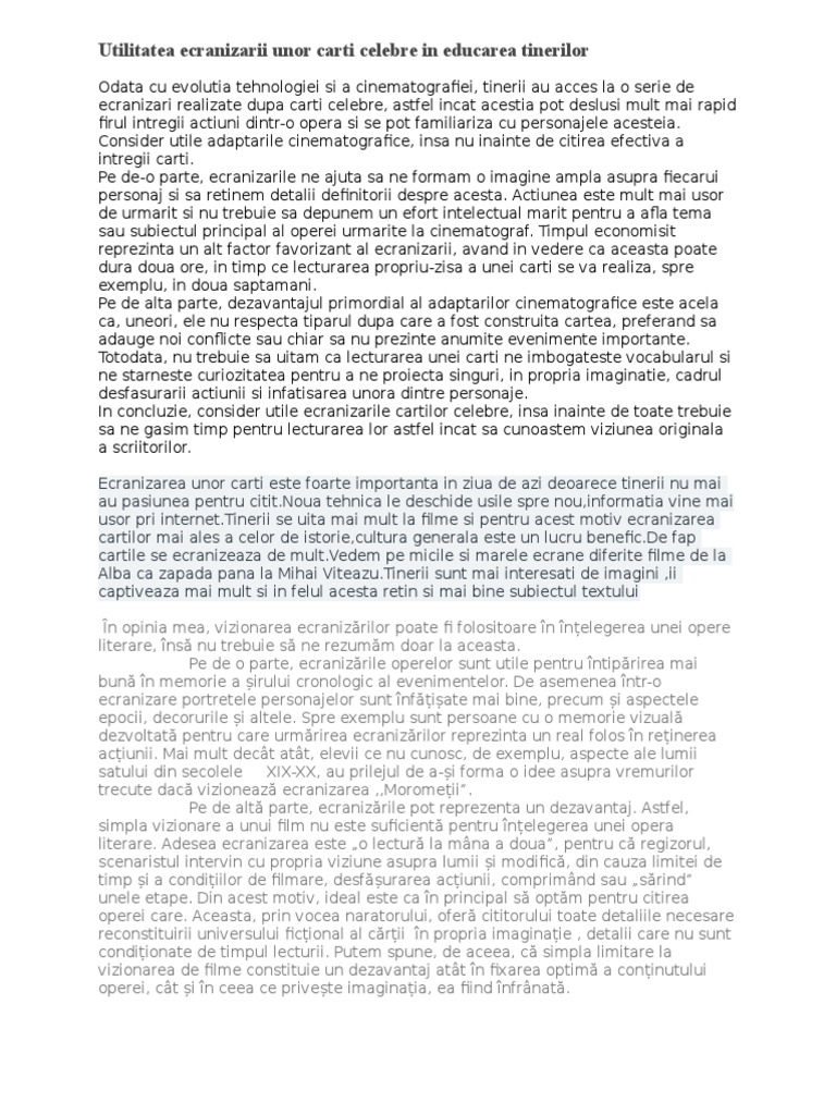 Utilitatea Ecranizarii Unor Carti Celebre In Educarea Tinerilor