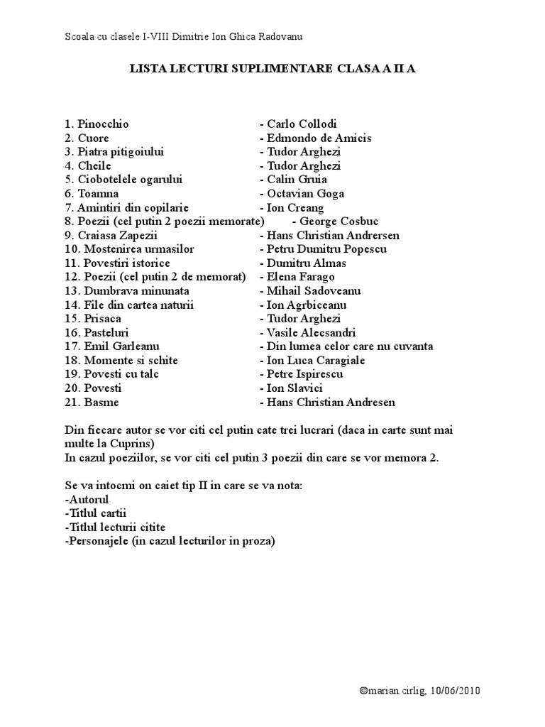 Lista De Lecturi Obligatorii Pentru Clasa A Va