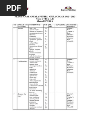 13 Planificare Anuala Limba Engleza L1 Spark 4 Clasa A Viii A 09061607 Verb Adjective